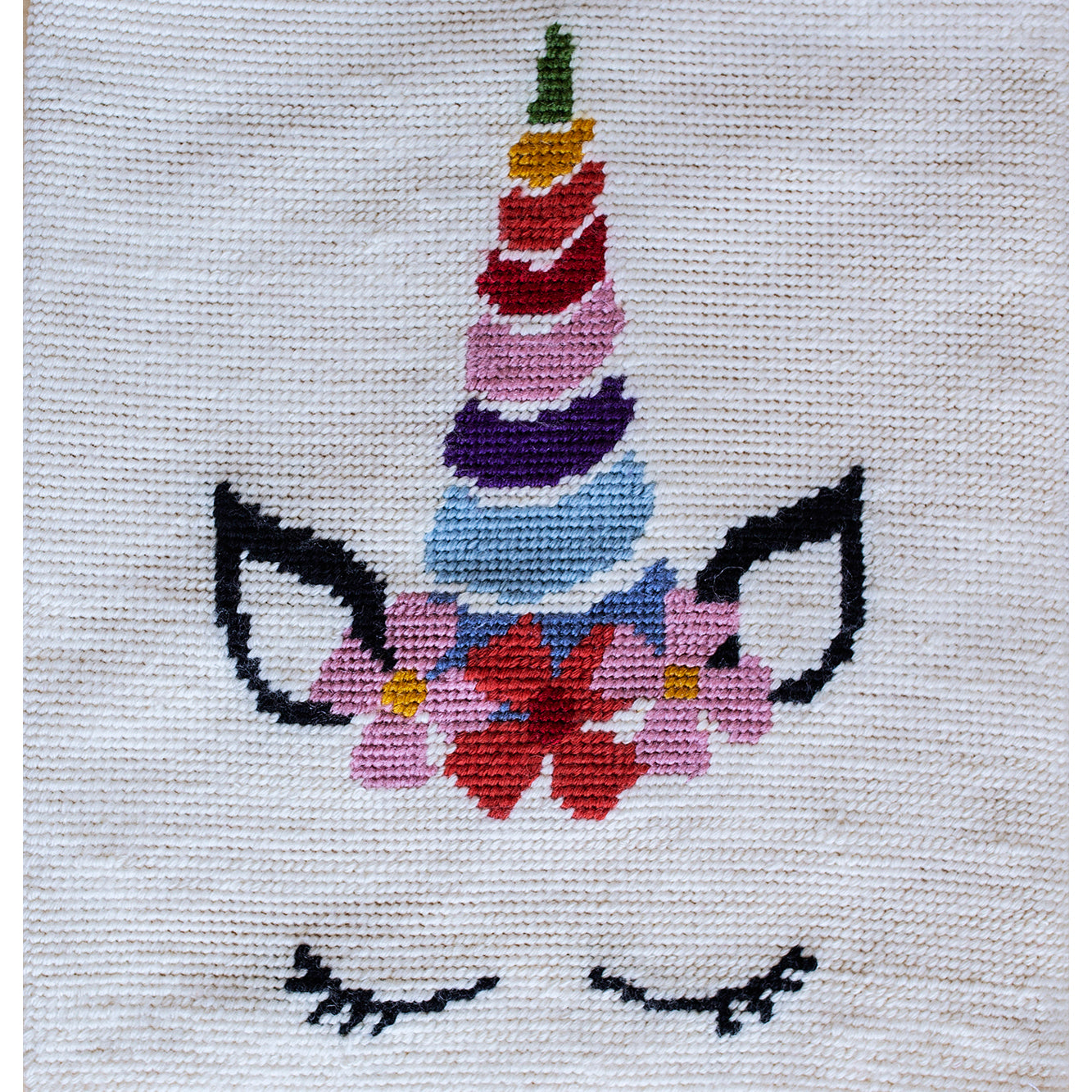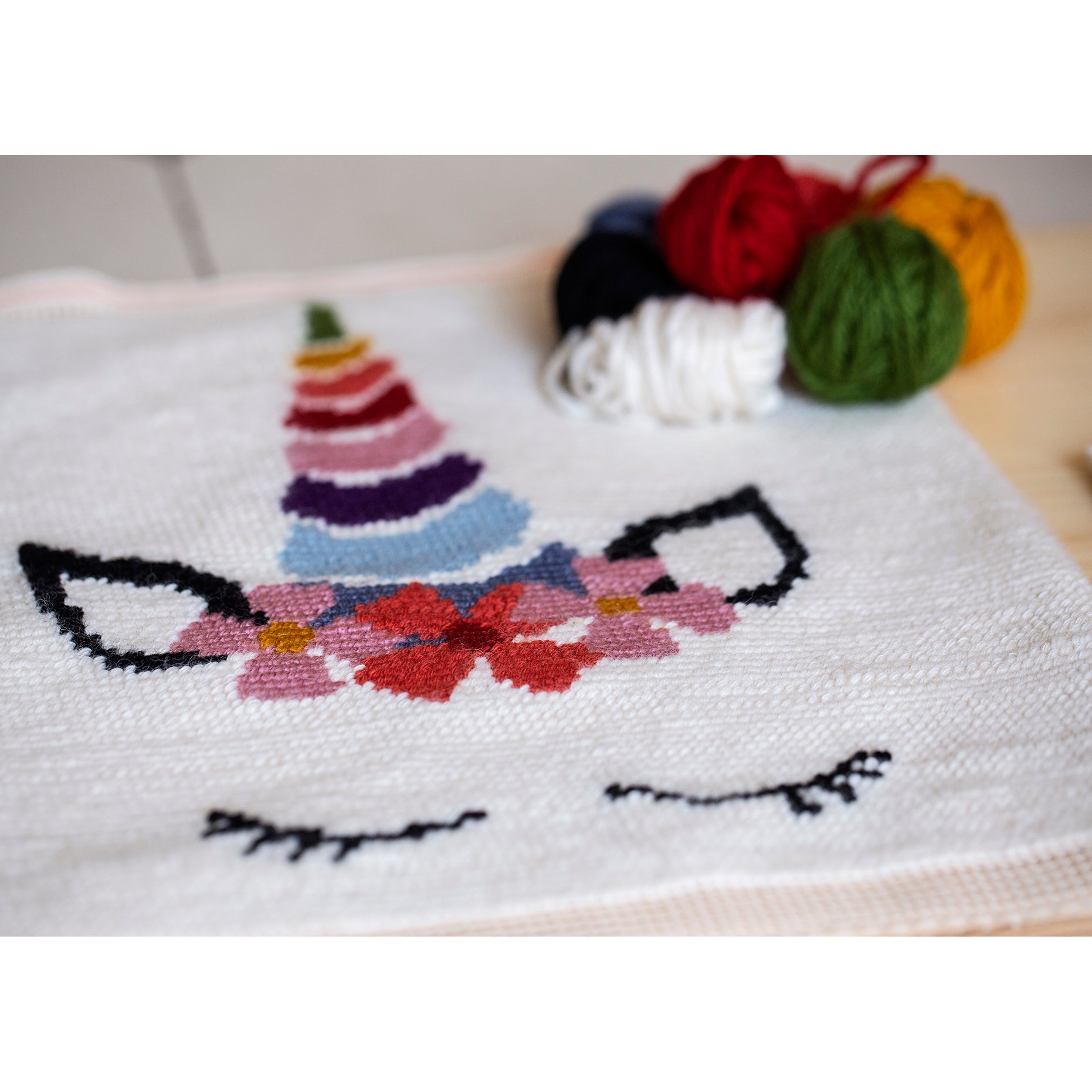 El KIT UNICORNIO incluye todo el material necesario para bordar un cojín en medio punto o petit point como el de la fotografía. Todos los kits de DELICATELA se pueden bordar a punto de cruz. En ese caso, es posible que necesite más lana de la contenida en este kit.